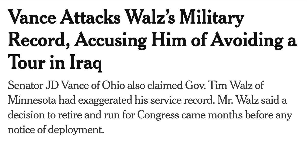 The first seven paragraphs of the New York Times article are devoted to recounting Vance’s false claims — without once even hinting at their falsity. The article portrays this as a problem for Walz instead of for Vance — and thus makes it so.