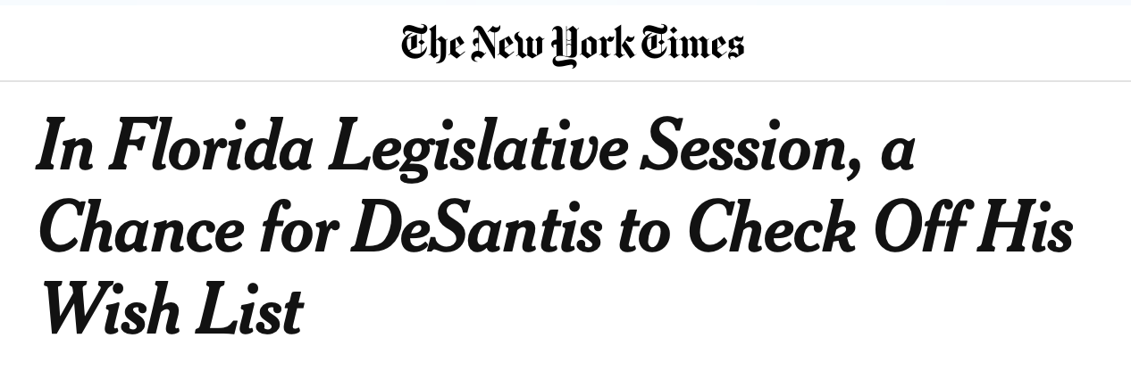 That brings me to this week’s New York Times feature on Ron DeSantis’s legislative agenda.