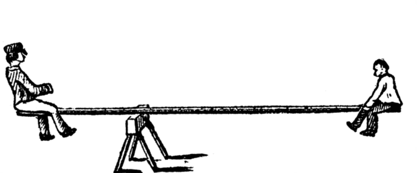 These two people are “balanced” on the fulcrum. But in order to achieve this balance, the fulcrum is placed to favor one person. The people may appear at a glance to have equal weight, but this is misleading — because the seesaw itself is not balanced, as we would quickly see if there were no people on it.
