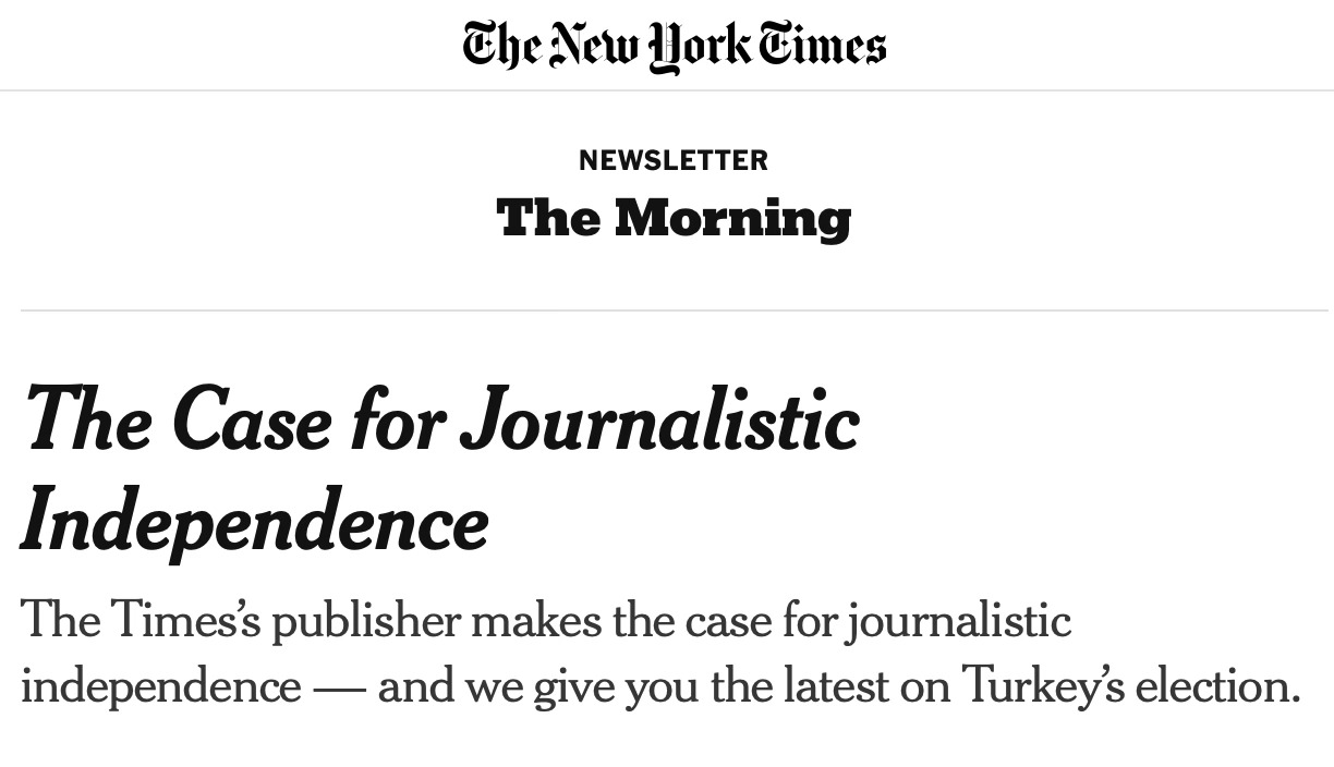 At some point in recent years Times leadership abandoned the word “balance” and adopted “independent” as its mantra, likely because the critique of false balance has become so widely accepted. In his Semafor interview, Kahn used the word “independent” three times to describe the Times’ approach to journalism. It was the core theme of Sulzberger’s lengthy 2023 Columbia Journalism Review piece, summarized in the Times’ flagship newsletter as “The Case for Journalistic Independence.”