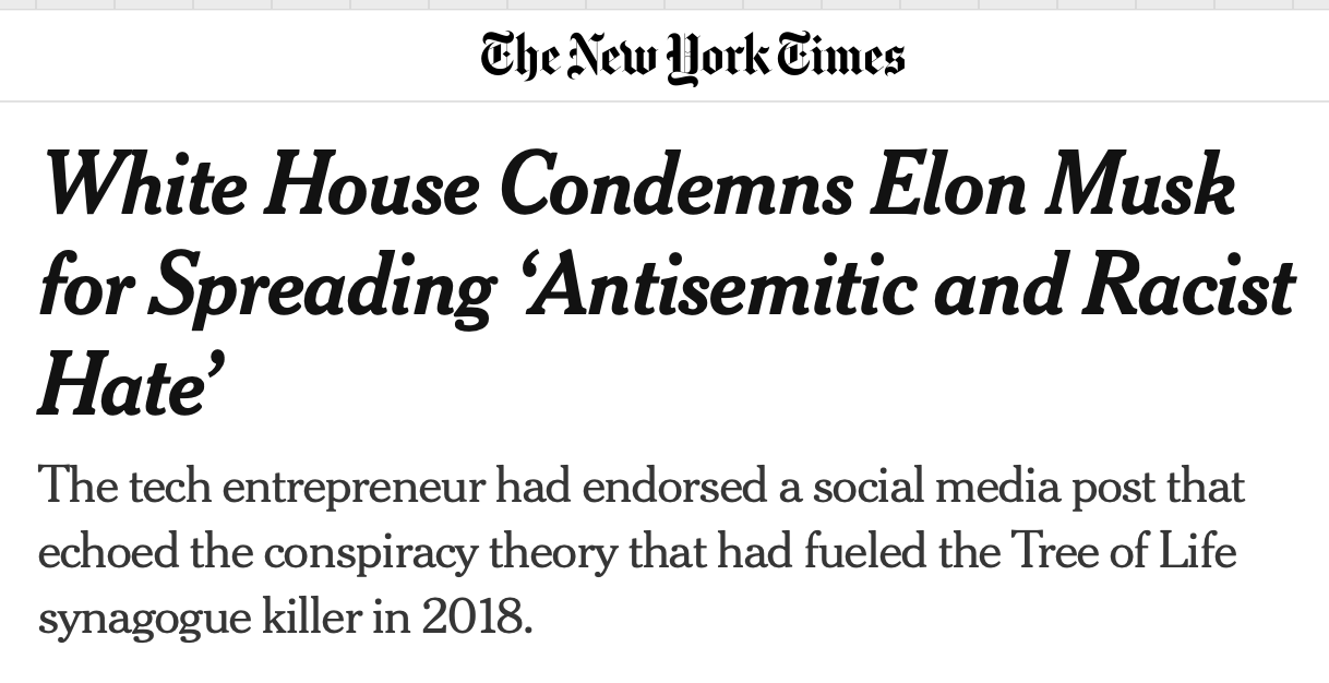 What kind of context would be helpful to readers in assessing Musk’s characterization of NPR’s CEO? Well, the fact that Musk spends more or less all his time these days peddling various racist lies should be pretty high on the list. Though the New York Times has politely ignored Musk’s racist “great replacement” propaganda,4 the paper is well aware of Musk’s bigotry: