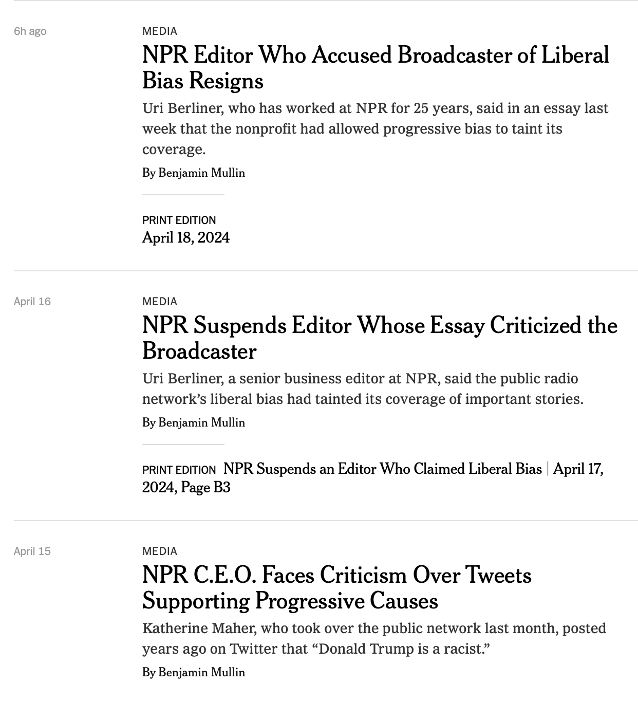The Times article, by Benjamin Mullin, doesn’t get around to mentioning even a single example of criticism of NPR CEO Katherine Maher’s tweets until the fifteenth (15th) paragraph,1 when it tells readers: