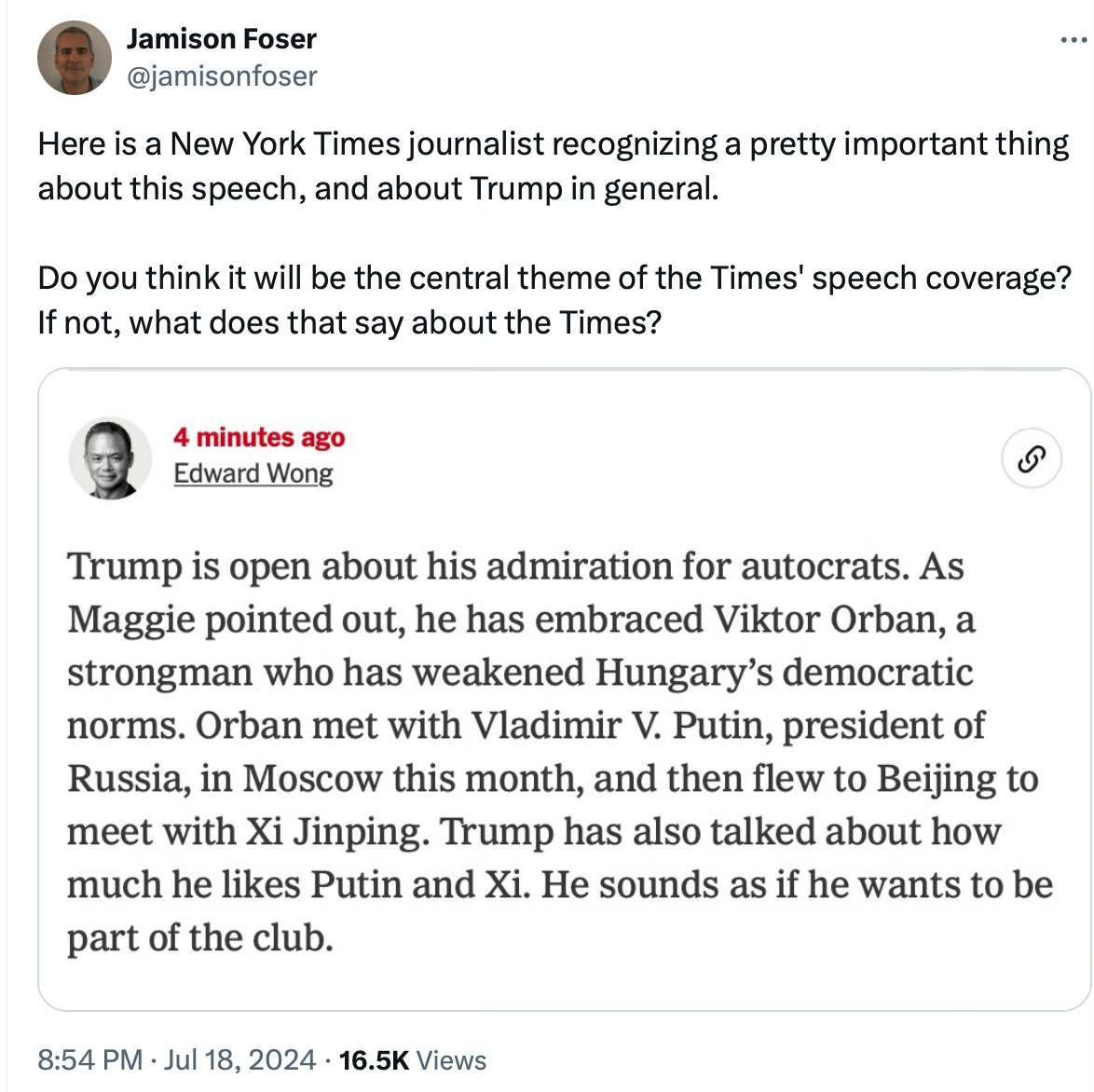 An American presidential candidate using his party’s nominating convention to express admiration for foreign dictators — and to tout their endorsement of his campaign — seems pretty noteworthy to me. And it caught the eye of at least one New York Times reporter, too: