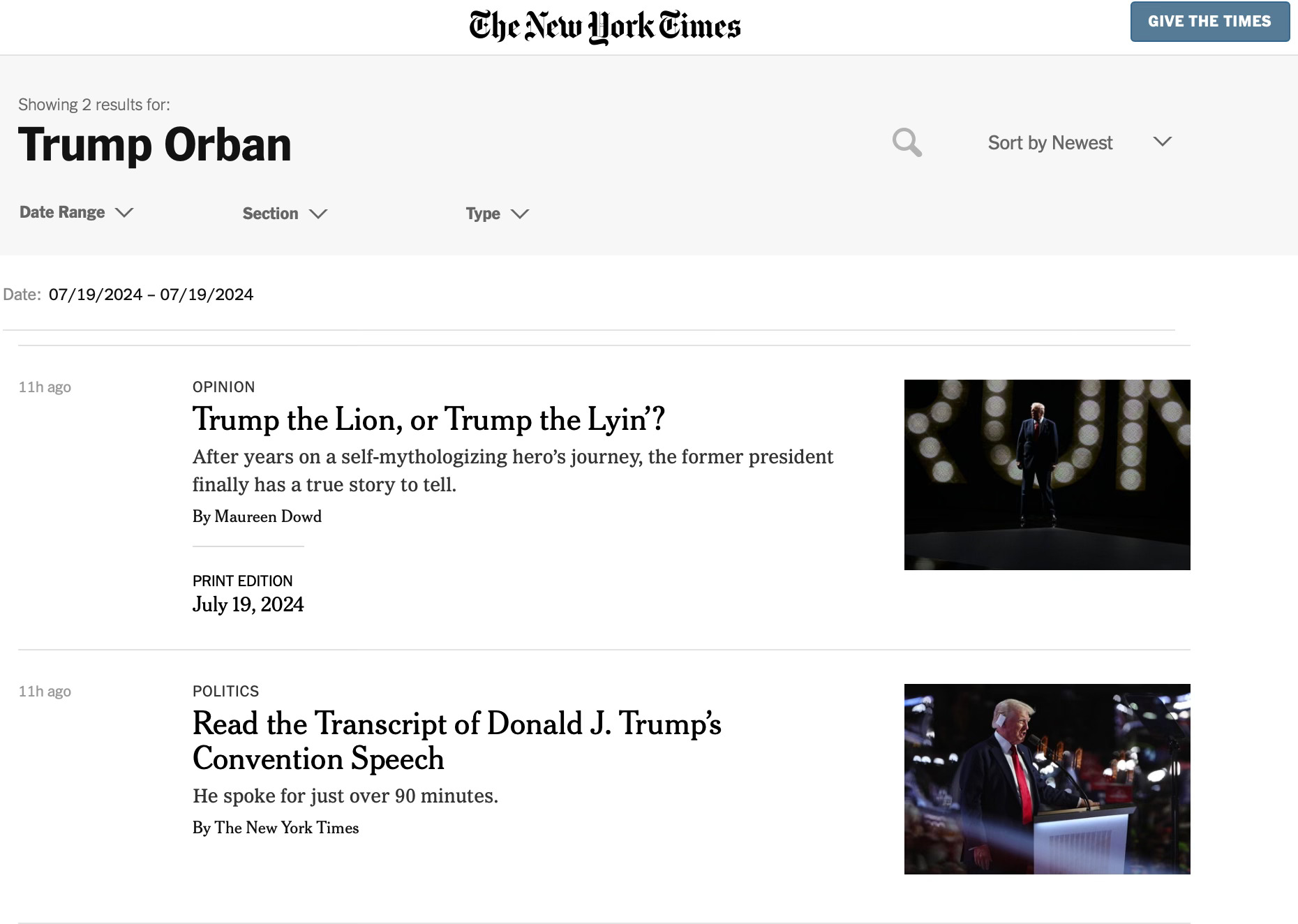 Yet Trump’s praise for Orban is entirely absent from the New York Times’ news coverage of Trump’s speech. A search for the words “Trump” and “Orban” on the Times’ website since the speech yields only two results: A transcript, and a Maureen Dowd opinion column that spent only three words (“praising Viktor Orban”) on the matter.5