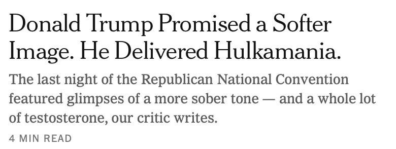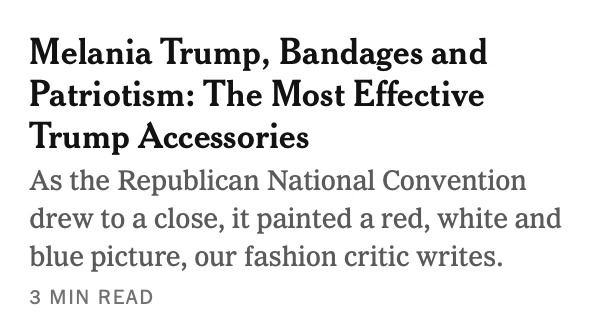 Meanwhile the Times’ homepage currently features articles about the last night of the Republican convention written by the paper’s television critic and fashion critic. ↩