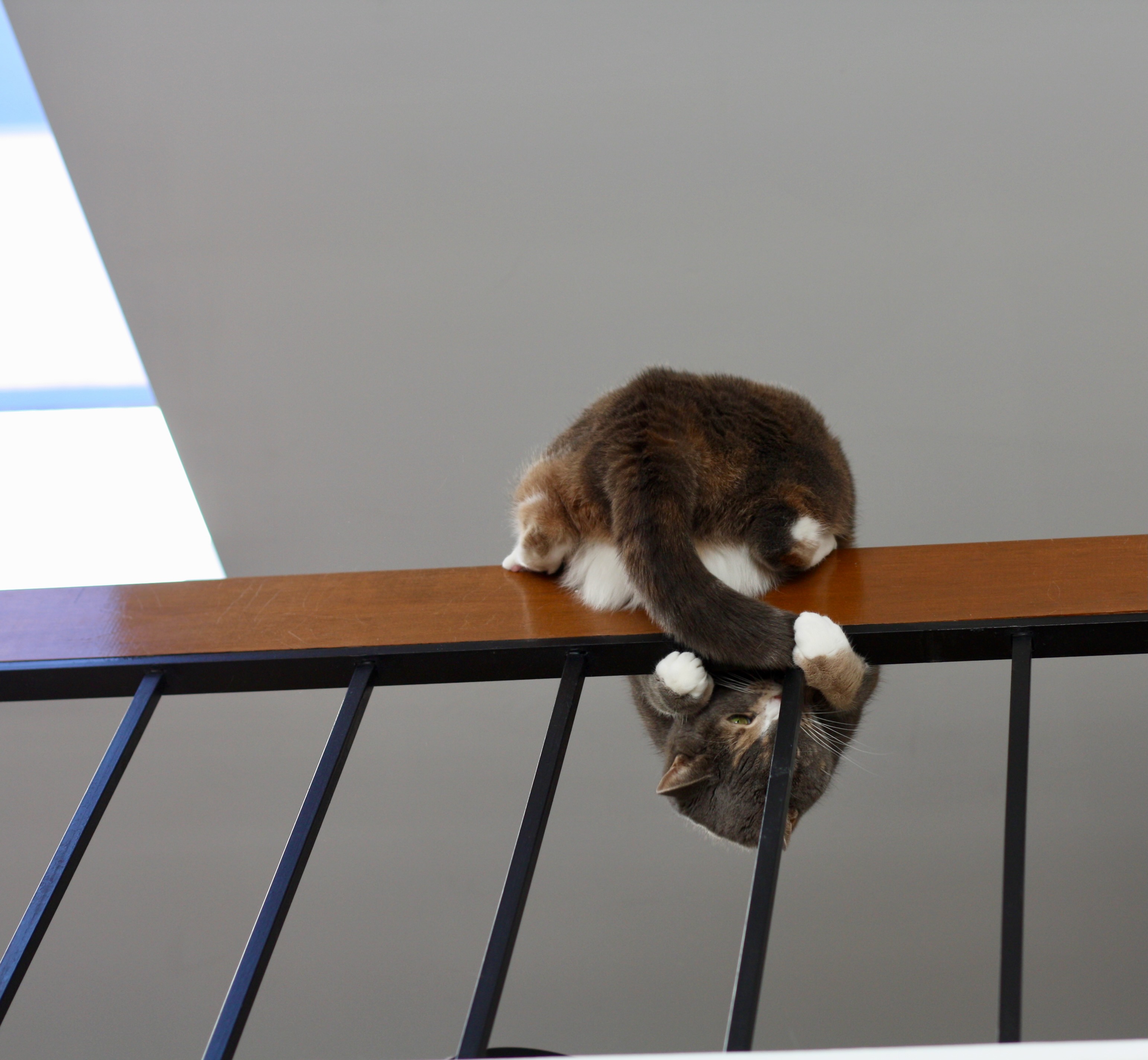 This did not strike me as a good idea, but I respected it. I was also sure she would fall some day. And then one day she did. She landed hard on the floor about three feet from me, bounced up, and immediately ran to a far corner of the apartment to check herself out. Satisfied nothing was broken, she soon emerged to hop up on my lap, looking perhaps a bit embarrassed but not at all dissuaded from further similar adventures. She would fall from that railing again, at least two more times, but each time she got up again, body and spirit both unbroken. She had a quick, deep resilience I admired.