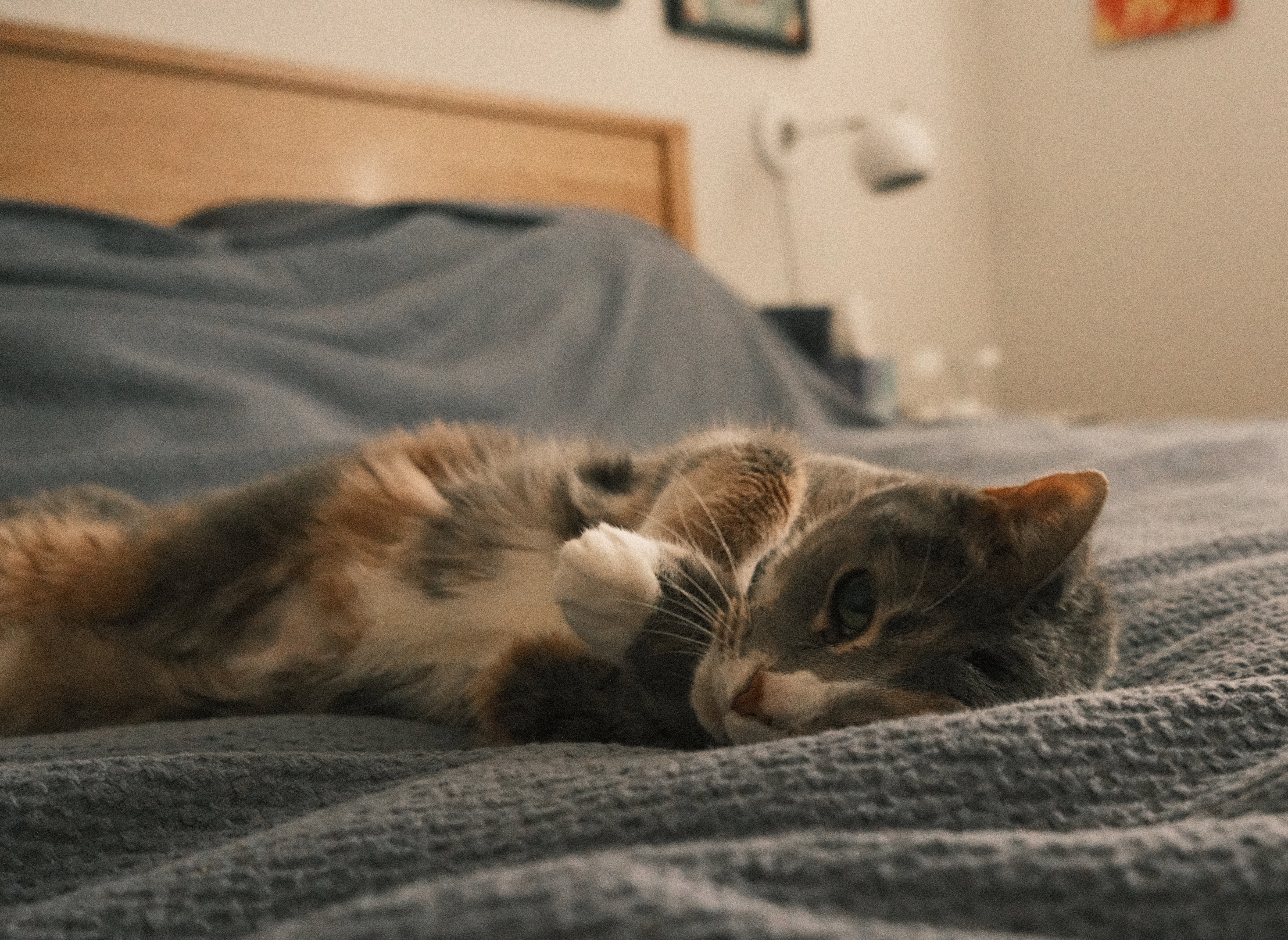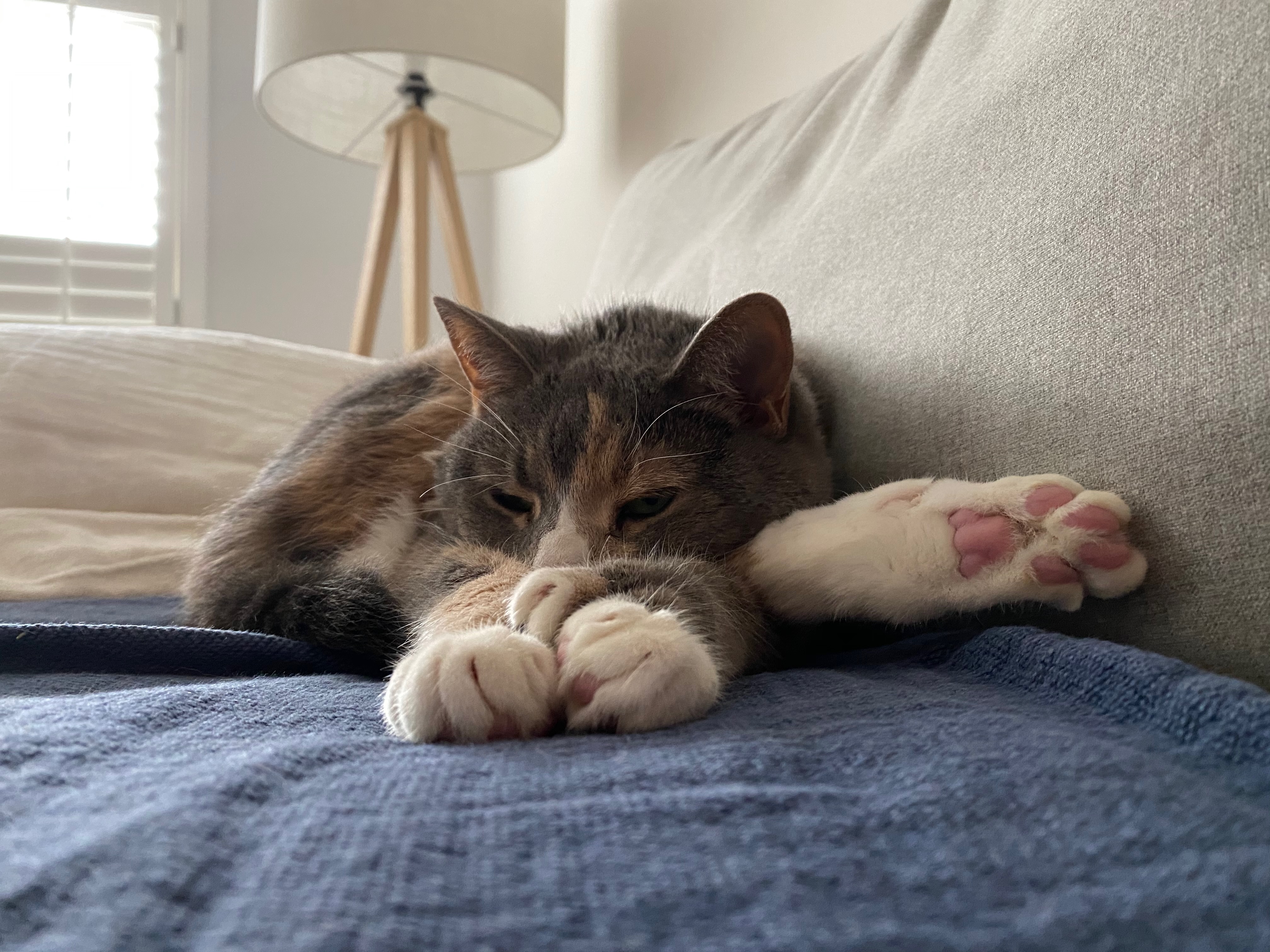 And so we got about six more real good weeks together, the three of us. Six weeks of lap-sitting, chin-scratching, belly-rubbing. Six weeks of headbutts and gentle purring and Catlong putting her big paw on my hand, pulling me close. Six weeks of worry and of daily subcutaneous fluid injections, which she continued to *not enjoy one bit* — and continued to not hold against us one bit. Six weeks of working beside (or, more often, underneath) her in bed, where she seemed more comfortable. Six weeks of not taking a moment of it for granted, of enjoying every sandwich.