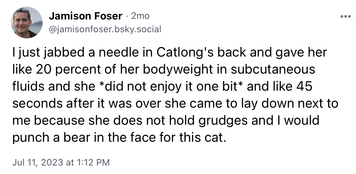 And so this is the strongest endorsement for animal companionship I know how to offer: I am fucking miserable, and I will be for the foreseeable future, and the 15 years we had with Catlong outweigh that a thousand times over.